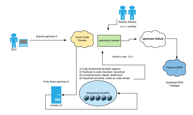We’ve revamped our QUADS Jenkins CI to use Docker containers and instantiate a full QUADS stack (wiki, wiki_db, quads, quads_db, nginx) for every patchset committed to Gerrit code review. Below is a not-so-artistic diagram of how it all works.