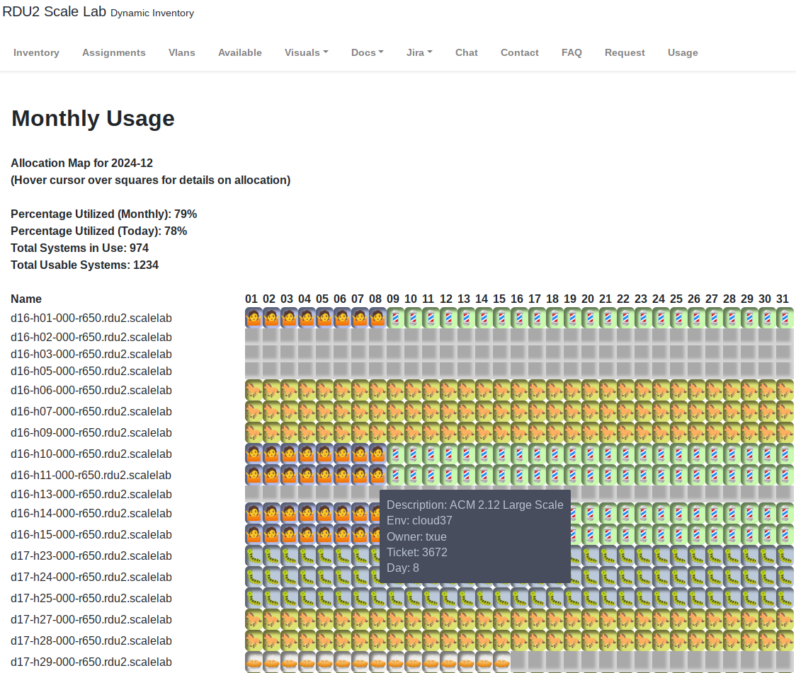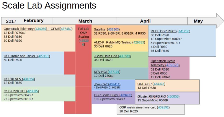 Below is an example of a multi-month view of Red Hat’s Performance and Scale R&D lab using QUADS to slice n’ dice up systems/network infrastructure to automatically build, deploy and reclaim varied, isolated multi-tenant workload assignments for disparate Engineering teams and products.