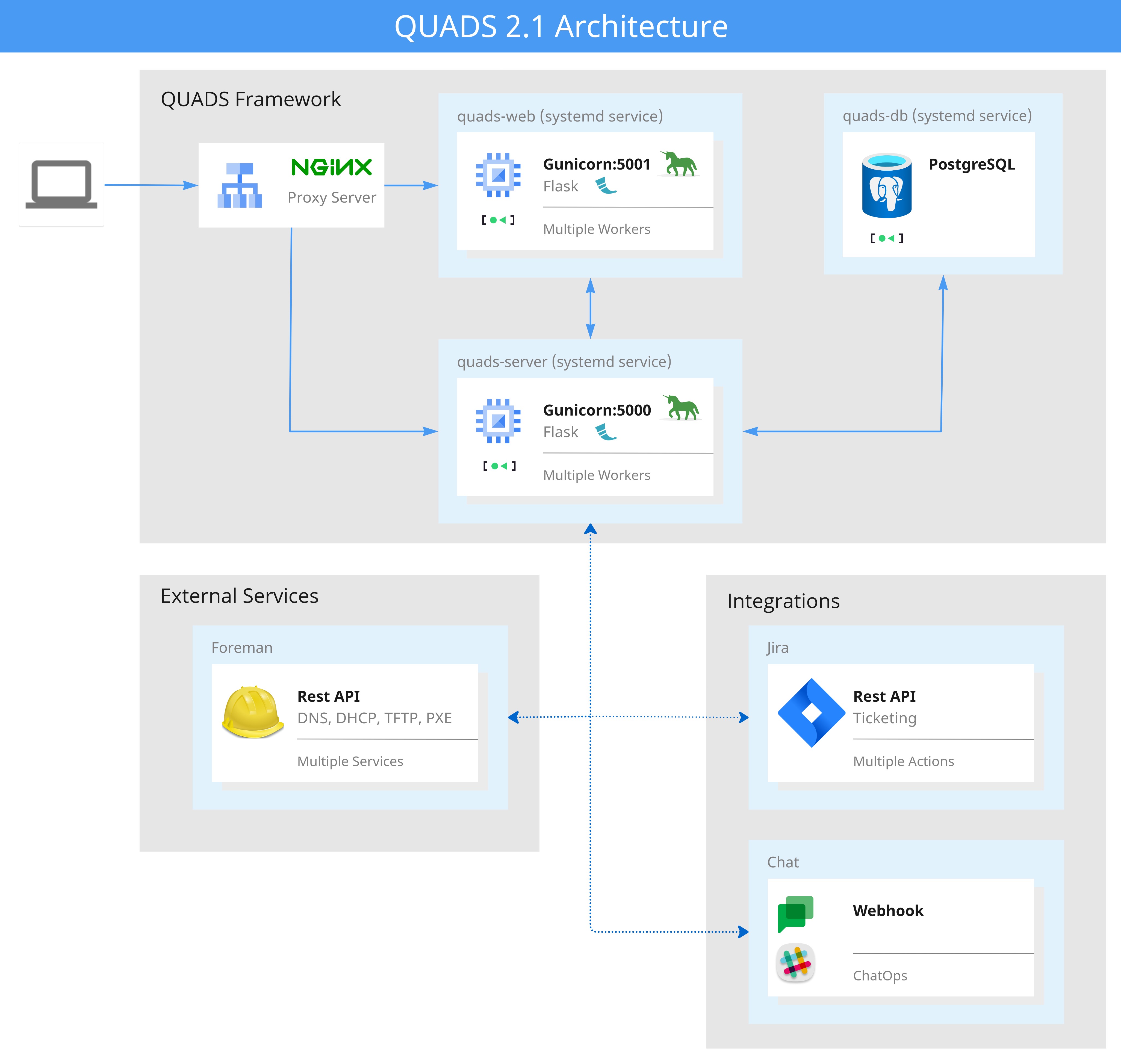 Below is a high-level summary of the architecture of QUADS 2.1 with Nginx, Flask, Postgresql, and Foreman with JIRA and Chat webhook integration.